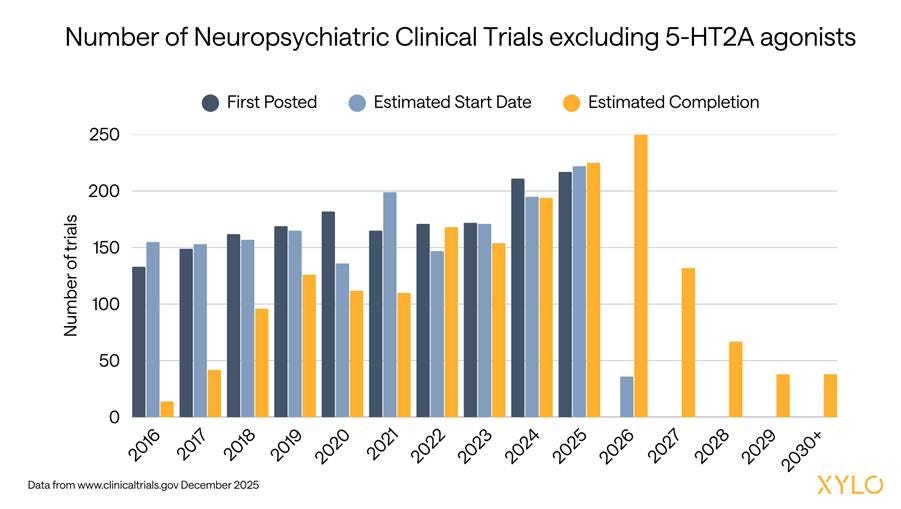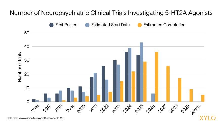 - Since 2016, 179 clinical trials involving 5-HT2A agonists for neuropsychiatric diseases have been registered on clinicaltrials.gov.