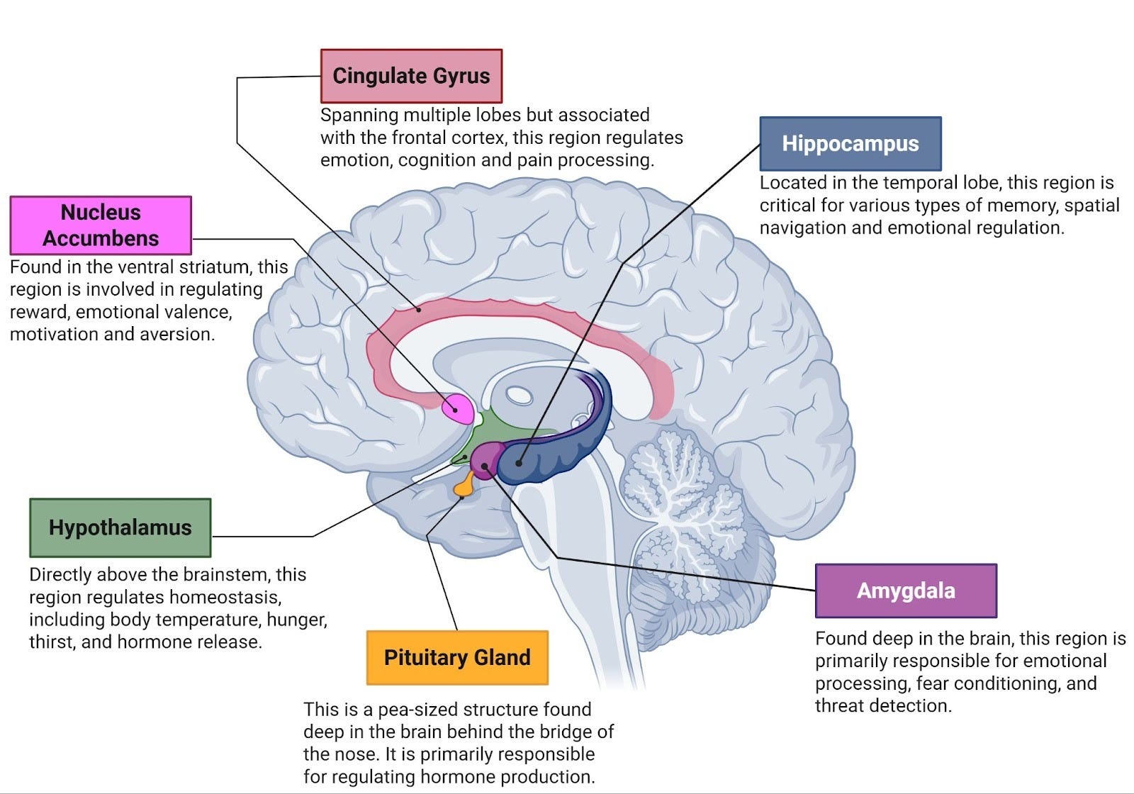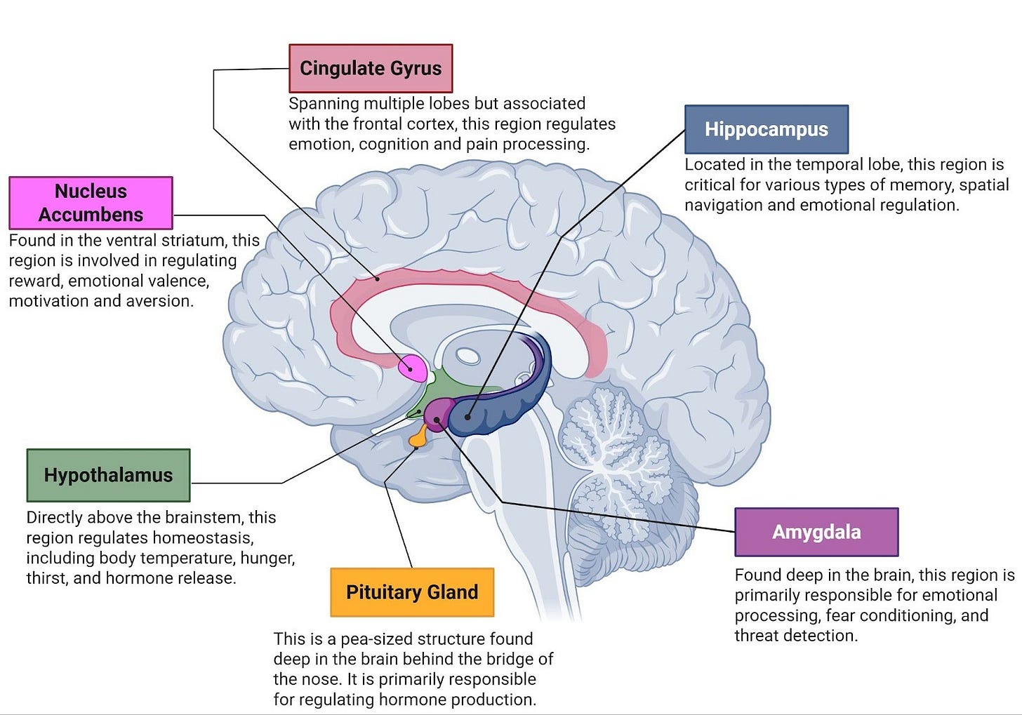 If we zoom deeper into the brain, there are also highly important subcortical structures that communicate with neurons across the cerebral cortex. Many of these regions belong to the mesolimbic system, often called the brain’s reward system, because its signaling plays a central role in emotional processing, motivation, and natural reward. Several of these structures are highlighted in Figure 2 (made with BioRender).