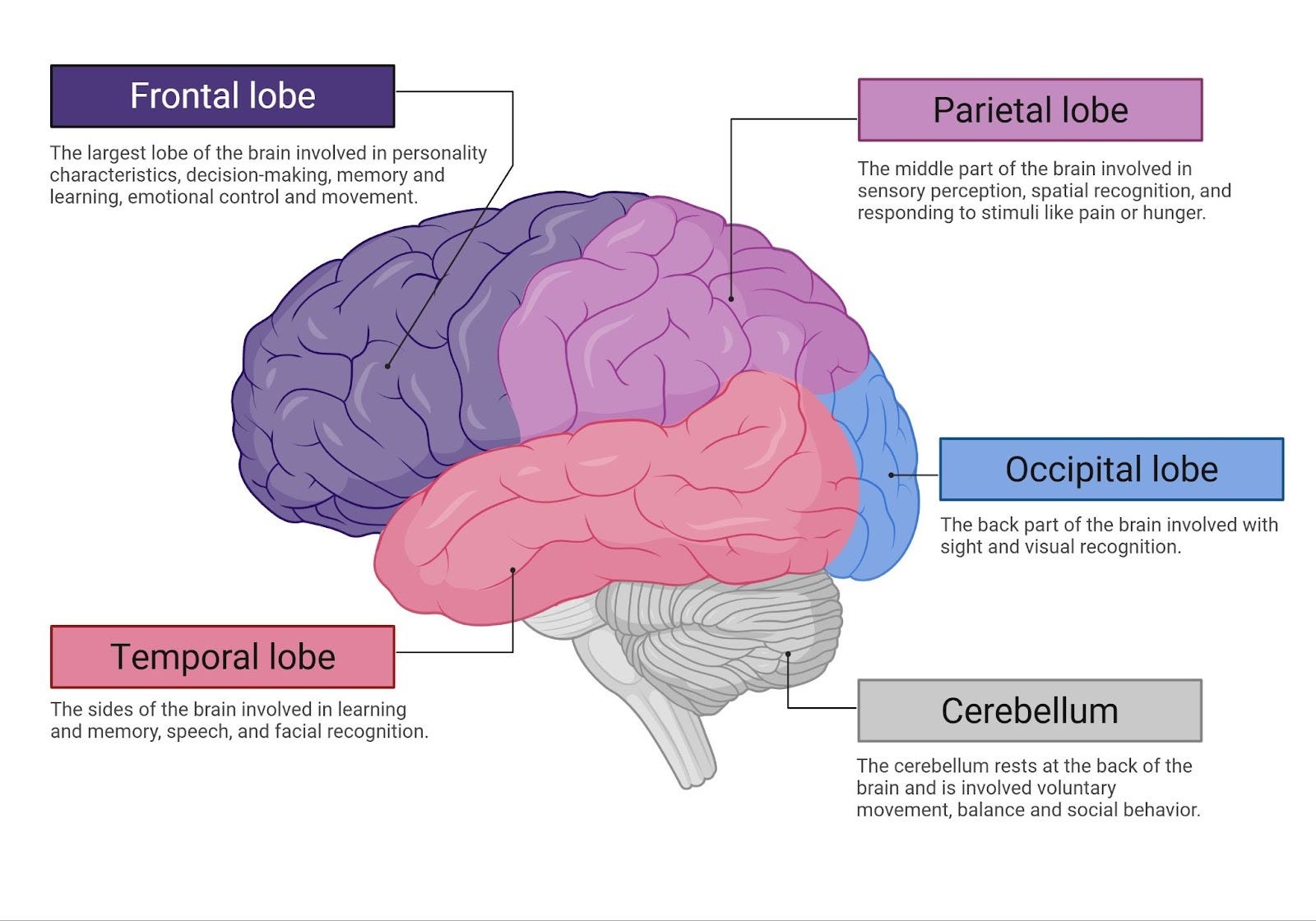 The human brain can be organized multiple ways, but at the highest level it can be divided into the cerebrum (or cerebral cortex), cerebellum, and brainstem. Most neurons - around 69 billion - are located in the cerebellum and about 16 billion in the cerebral cortex (Azevedo et al., 2009). Each brain region can be further divided into increasingly specific subregions. For example, the cerebral cortex has two hemispheres which contain four sections (lobes), each associated with distinct functions and microcircuits relevant to behaviors and neuropsychiatric disorders (See Figure 1; made with BioRender).