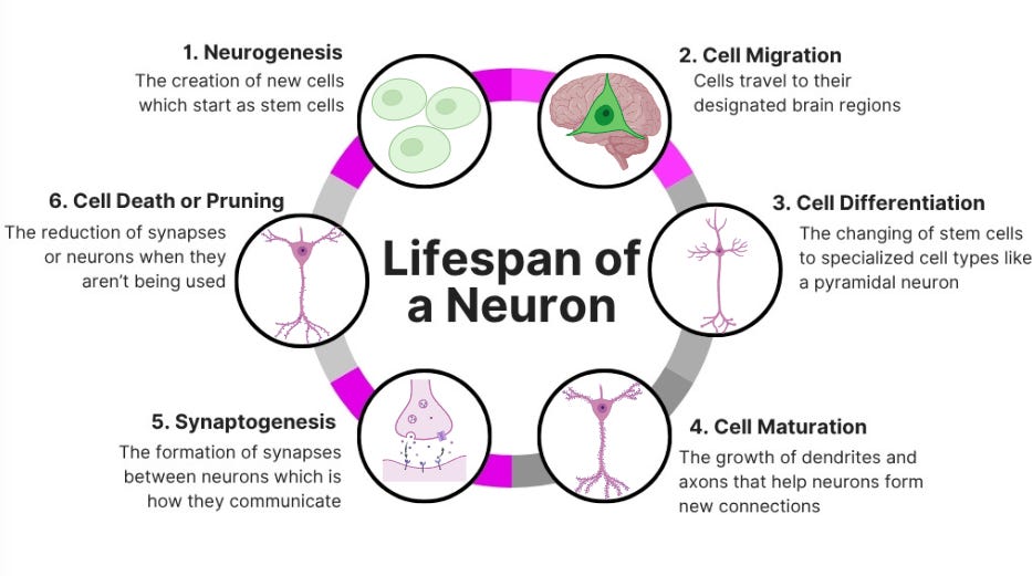 The brain is considered plastic, meaning it can reorganize, regenerate, and create new connections as humans learn and adapt. Plasticity begins before birth and continues into adulthood, although at a much lower rate. The stages of brain development follow 6 steps outlined in the figure below (made with BioRender; Kolb & Gibb, 2011).