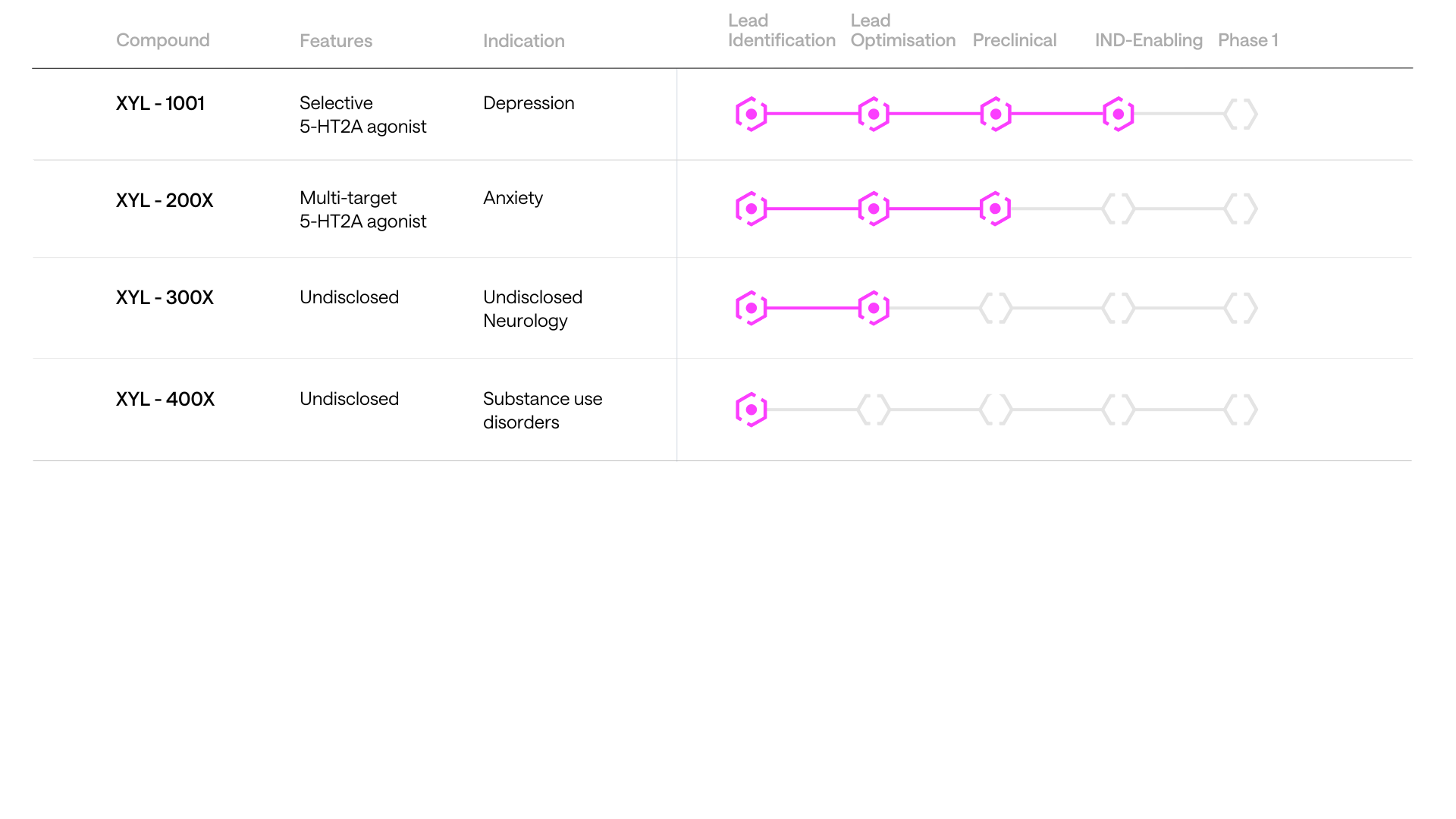 At Xylo, we combine world-class expertise in medicinal chemistry with cutting-edge computational drug discovery to develop a novel class of small molecules designed and optimized to target specific receptors that promote neuroplasticity while avoiding mechanisms linked to undesirable effects that restrict patient access.